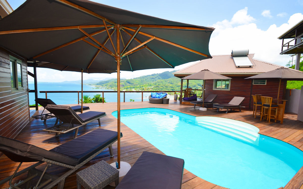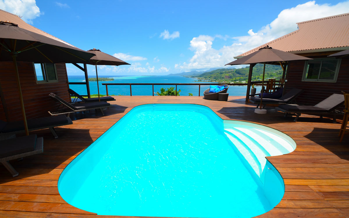 « Nichée sur les hauteurs non loin du centre d'Uturoa, la petite propriété propose 5 bungalows indépendants, une piscine avec un grand deck offrant une superbe vue sur le lagon »