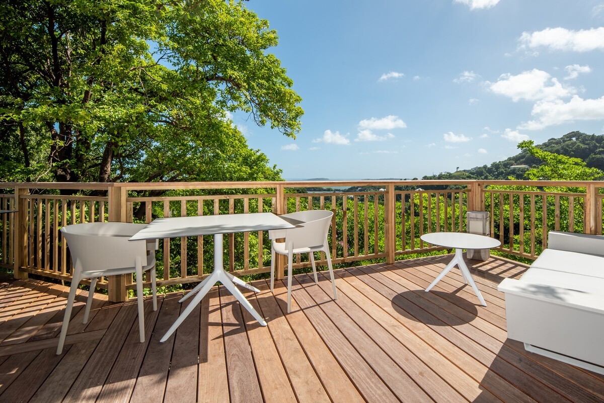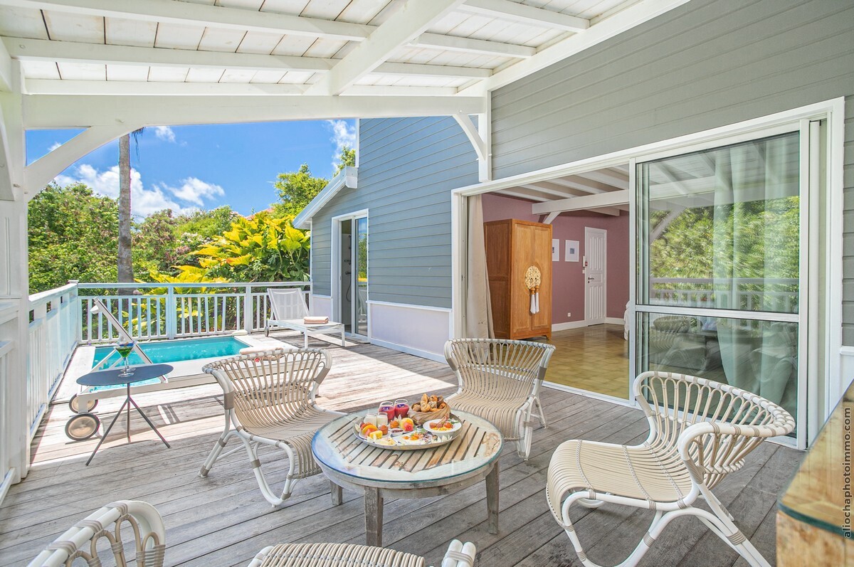 Perché sur les hauteurs de la Pointe Thalémont au François (à 30 minutes de l'aéroport), l'hôtel Plein Soleil est un petit joyau niché entre les cocotiers et flamboyants, dominant l'océan.