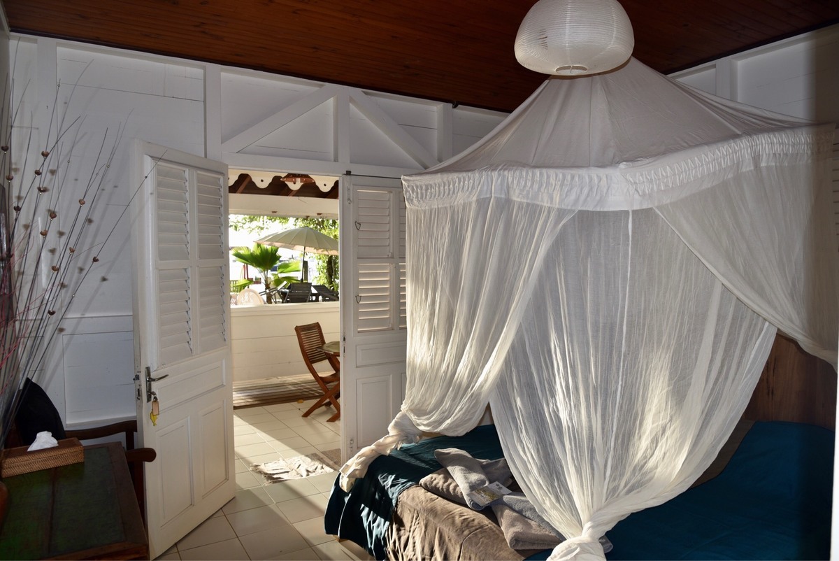 - 1 Bungalow coté jardin pour 2 personnes (Ti Case) 29m² + 22m² de terrasse. Avec accés direct à la mer barbeccue, table et transats reservés sur la plage. Climatisation, Wiffi gratuit, Cuisine équipée : frigo, micro-ondes, plaques de cuisson, machine à laver le linge.