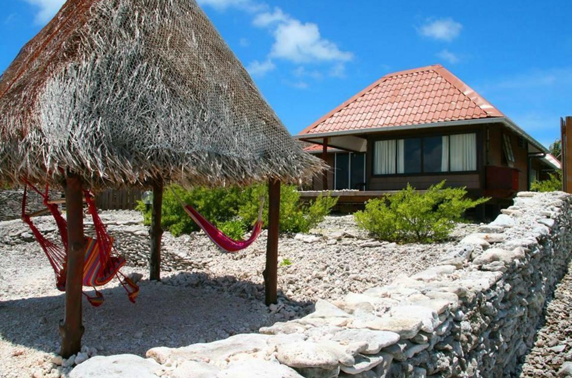Située côté récif, à 10min en voiture de l'aéroport de Rangiroa, le Miki Miki Lodge est une petite structure de 3 bungalows tenue par Janine.