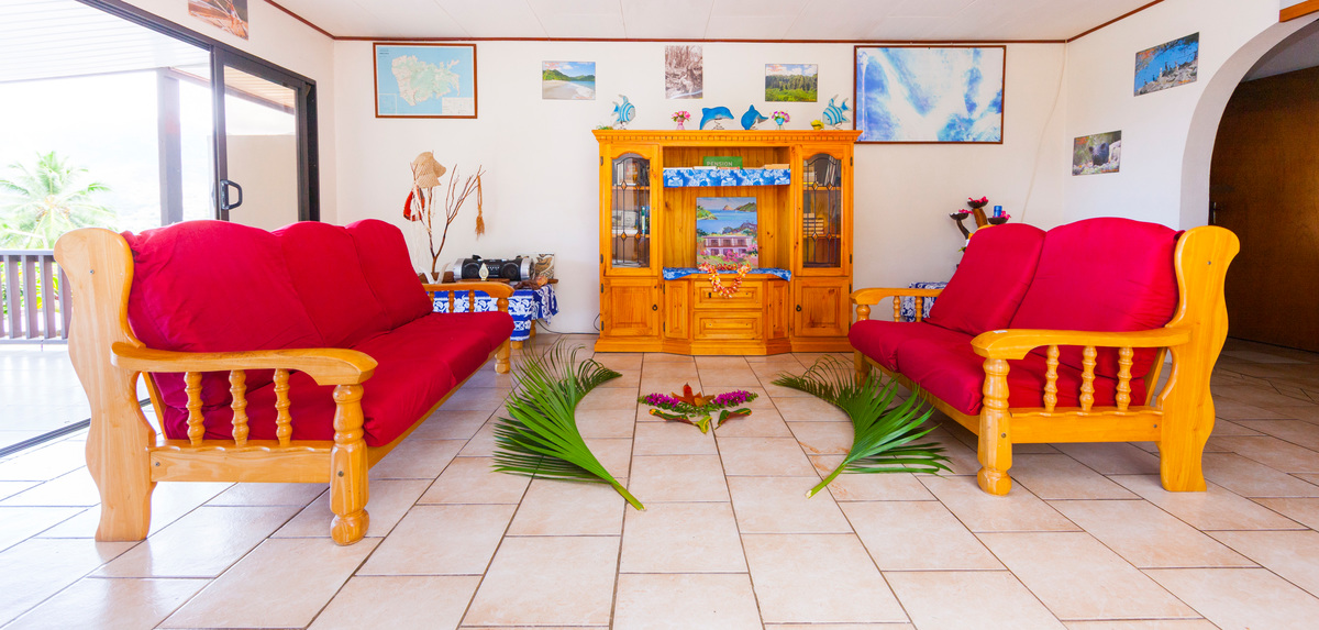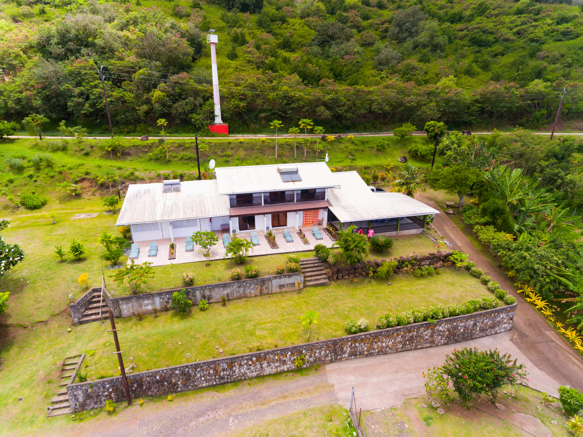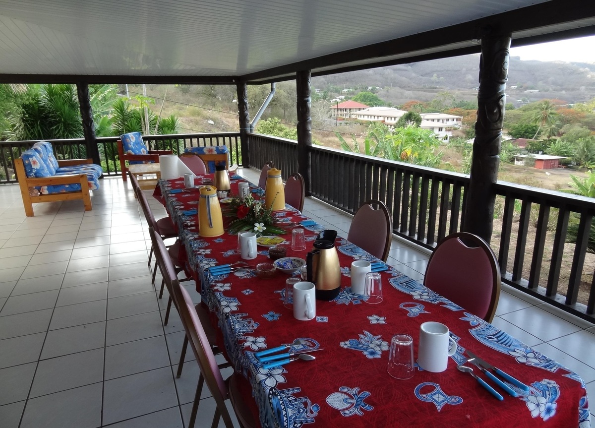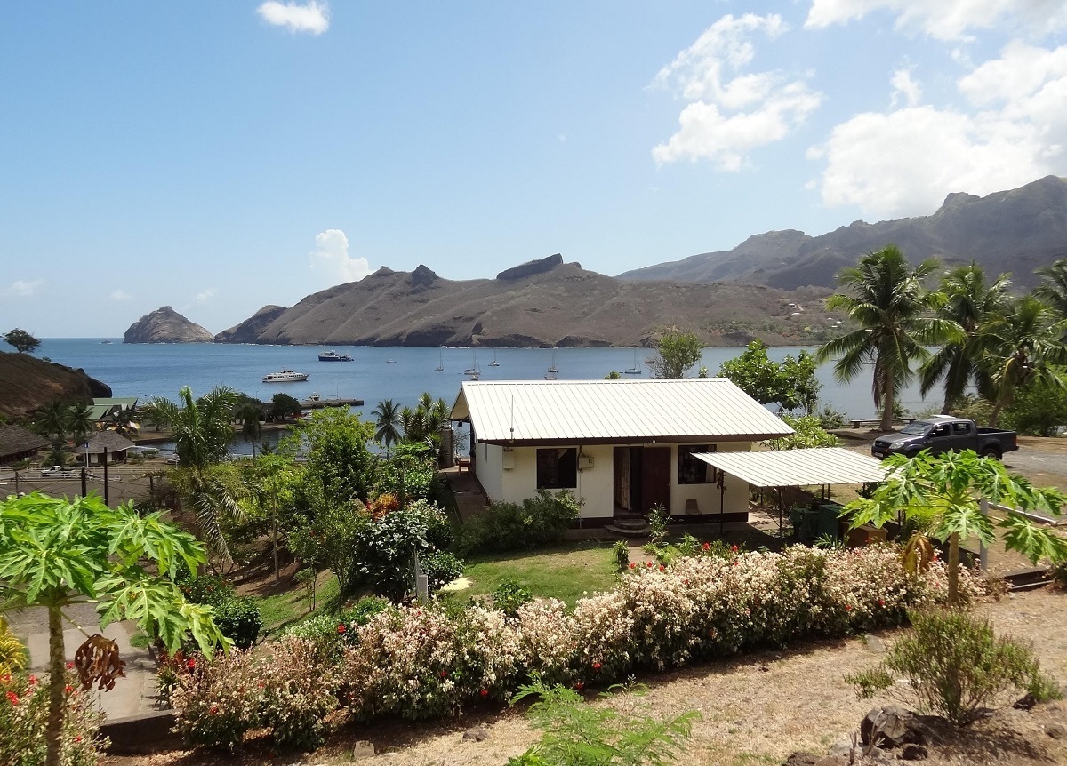 Perchée en flanc de colline, la pension Mave Mai surplombe le pittoresque village de Taiohae.