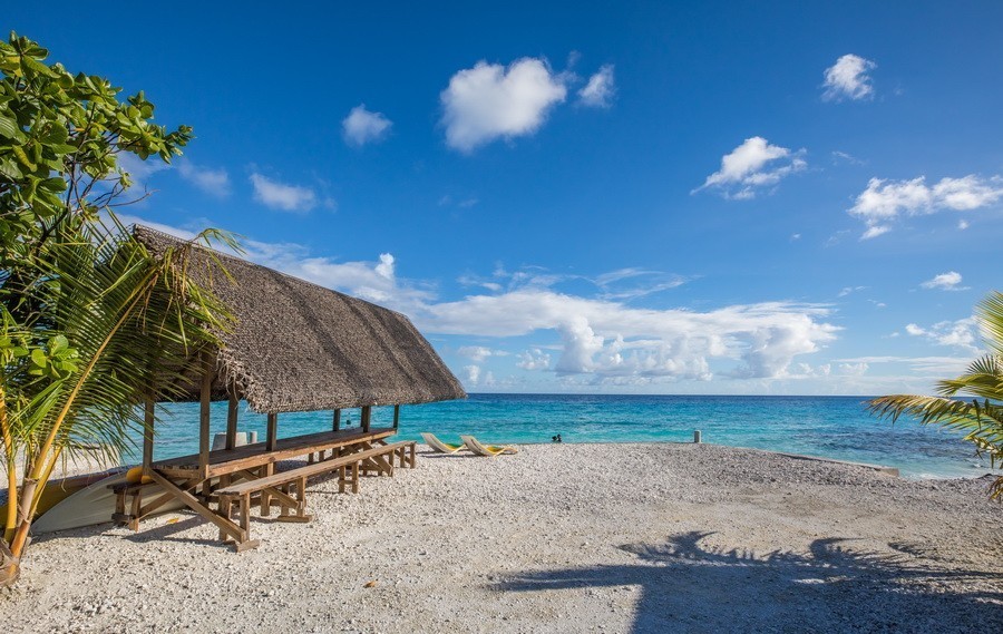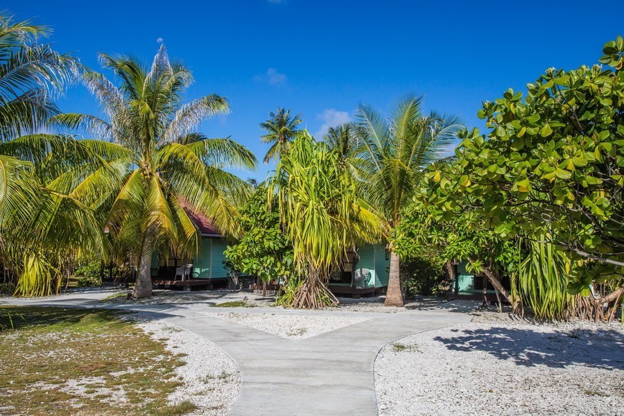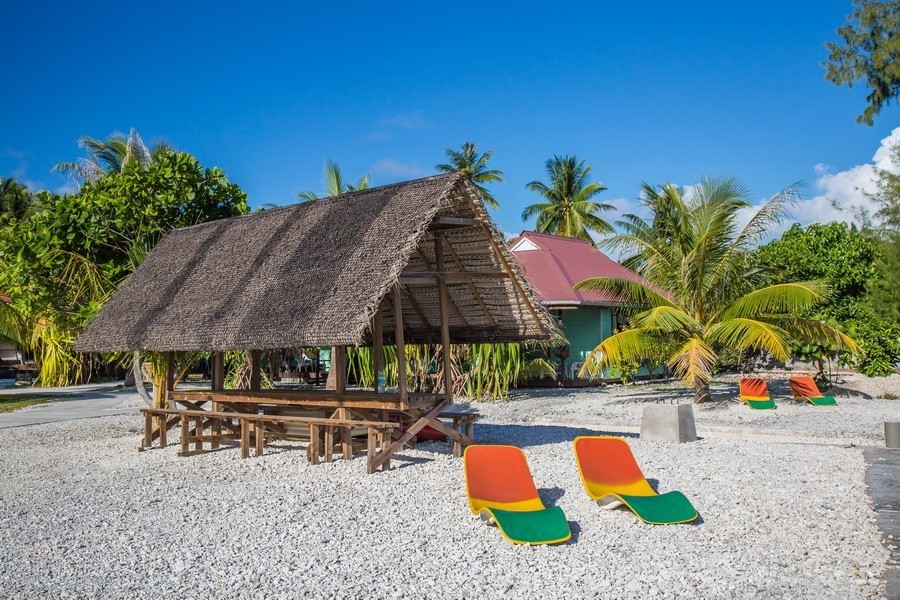 Situé entre l'aéroport et le village de l'île (environ 15 min) , cette pension se compose de trois bungalows indépendants donnant sur la plage ainsi que d'une grande salle à manger commune (fare pote) avec vue sur le lagon.