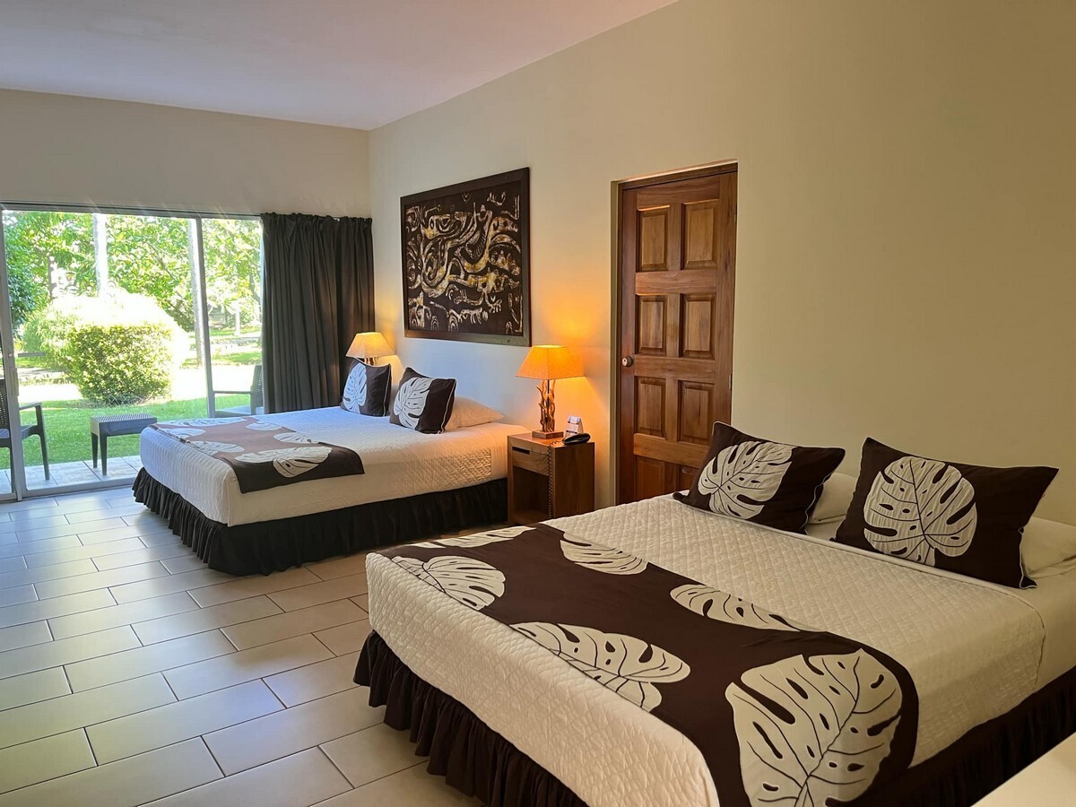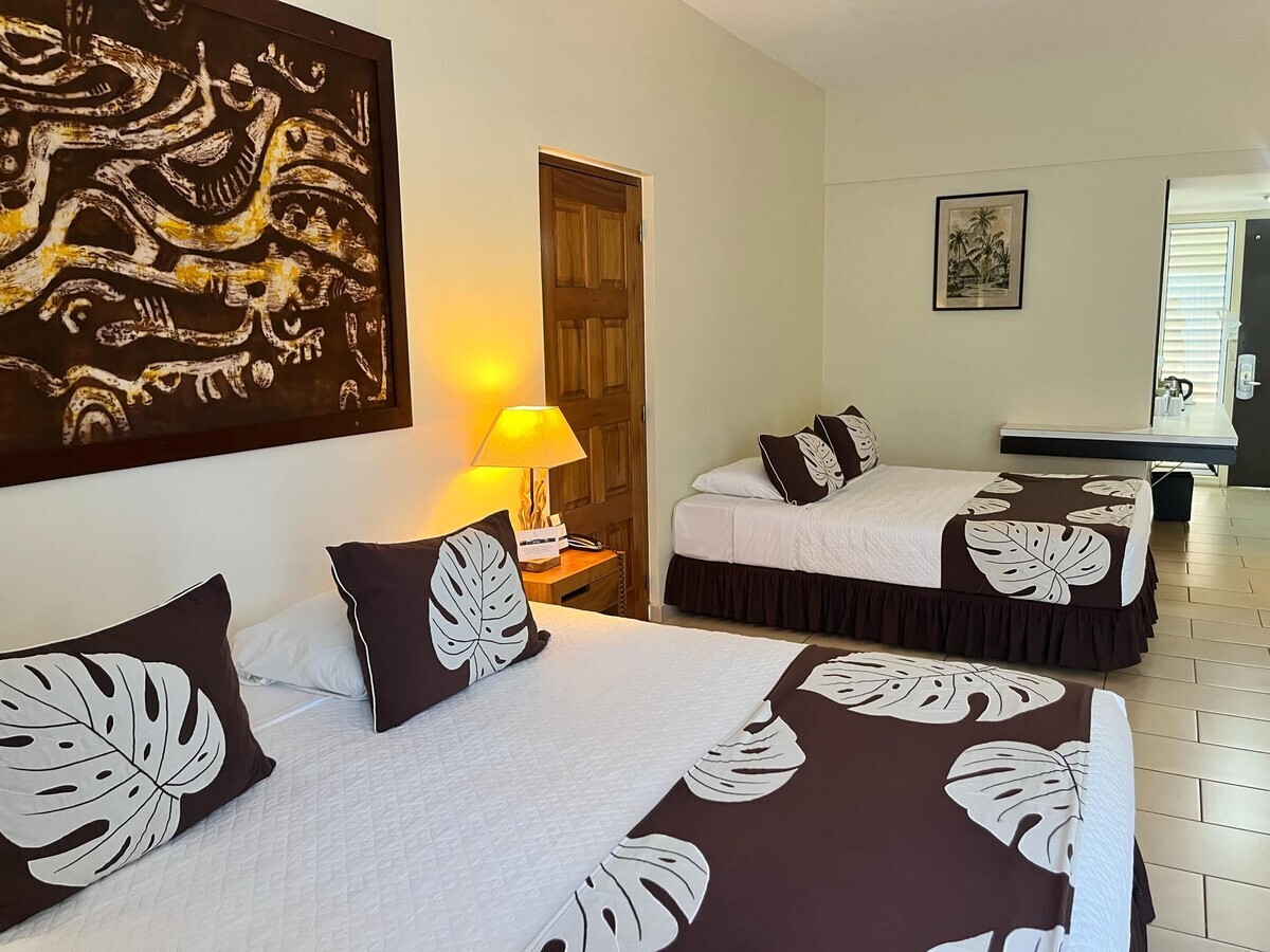 Les chambres sont décorées avec goût dans un esprit polynésien, et disposent d'un balcon ou d'une terrasse qui s'ouvre sur le grand jardin tropical, face à la montagne ou à l'océan, avec climatisation, salle de bain (avec baignoire) réfrigérateur, sèche cheveux, service à thé et café, accès wifi gratuit.