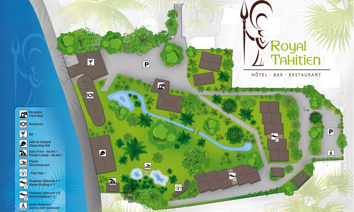 « L'hôtel Royal Tahitien est situé sur la côte est de Tahiti à proximité de Papeete. L'hôtel vous offre 3 hectares de jardin exotique et une plage de sable volcanique face à l'Ile de Moorea et aux couchers de soleil. »