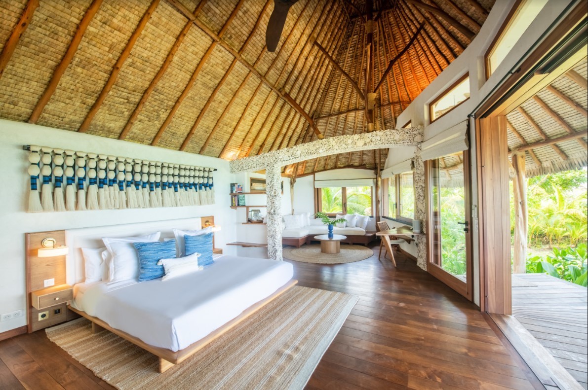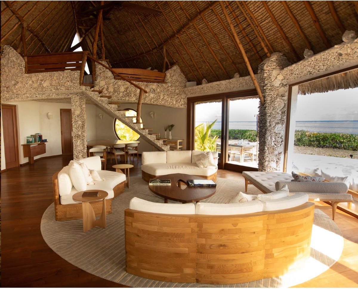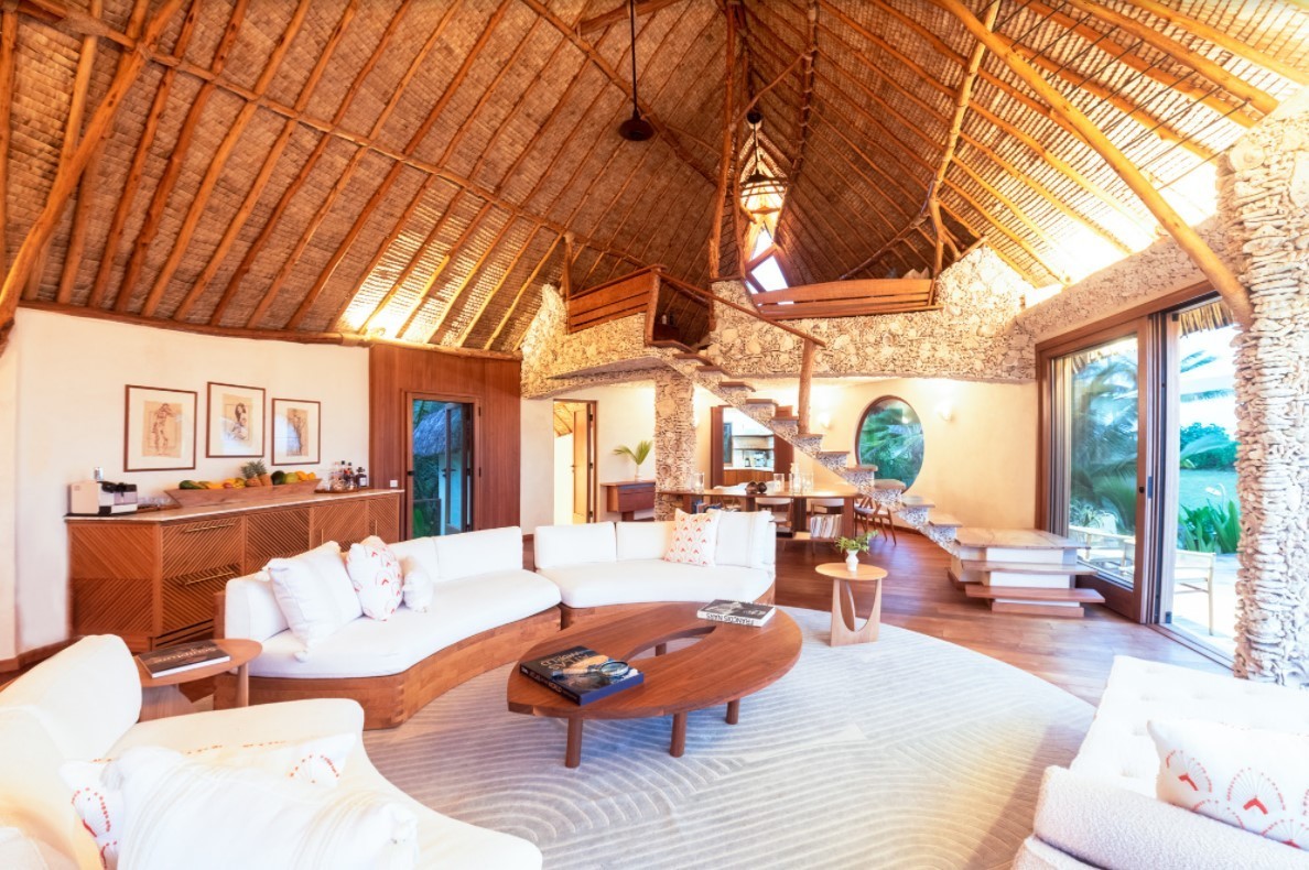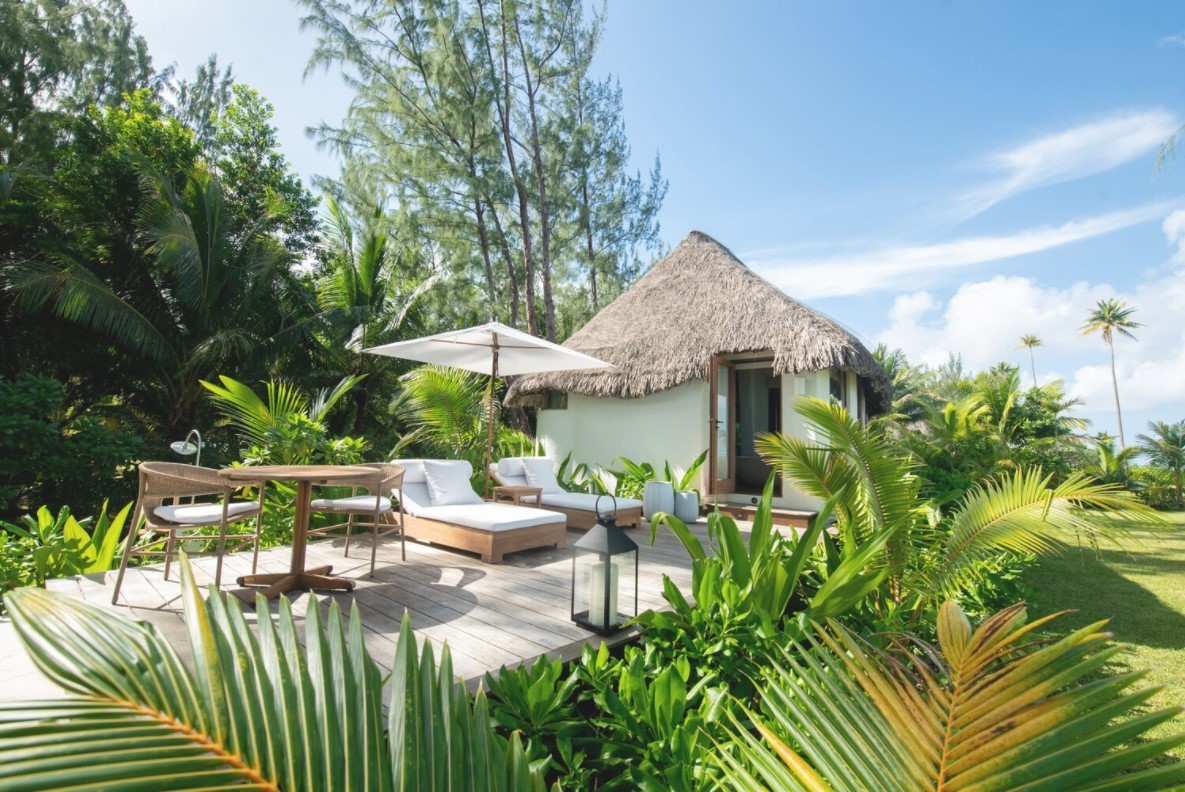 La décoration des villas est réalisée en corail issu de l'île, les charpentes sont en bois de fer du motu, les terrases en teck de Birmanie, les marches en acajou