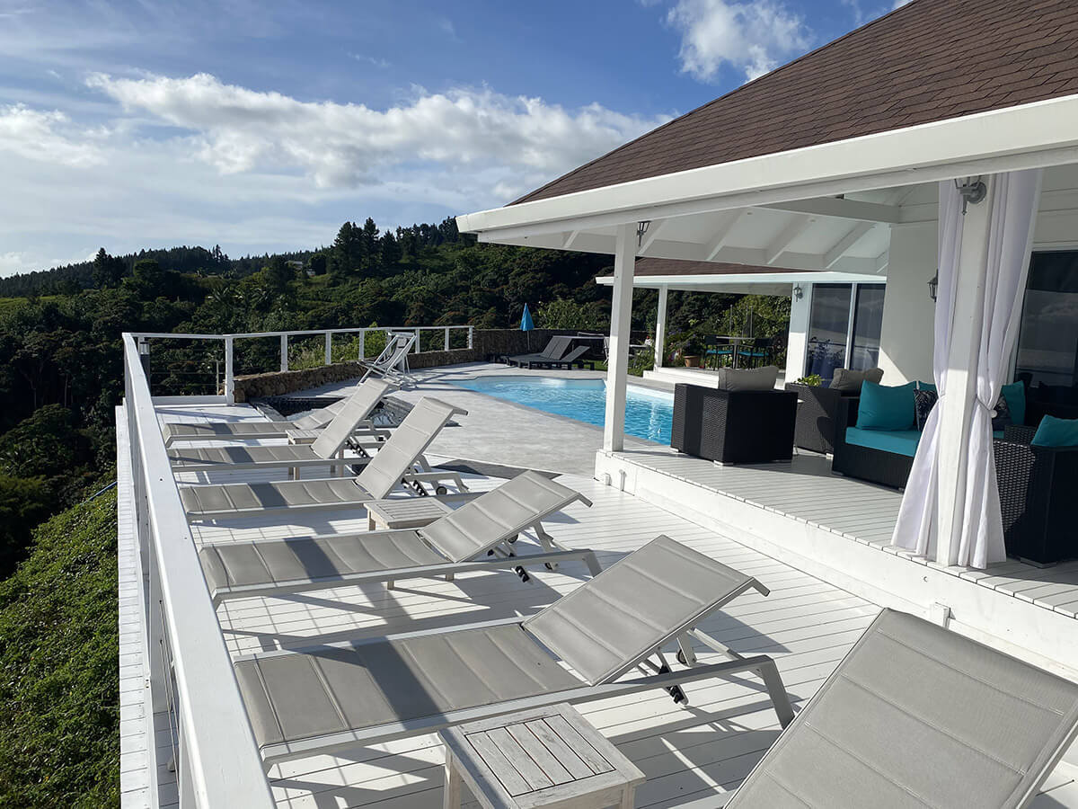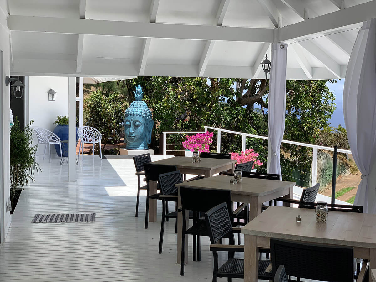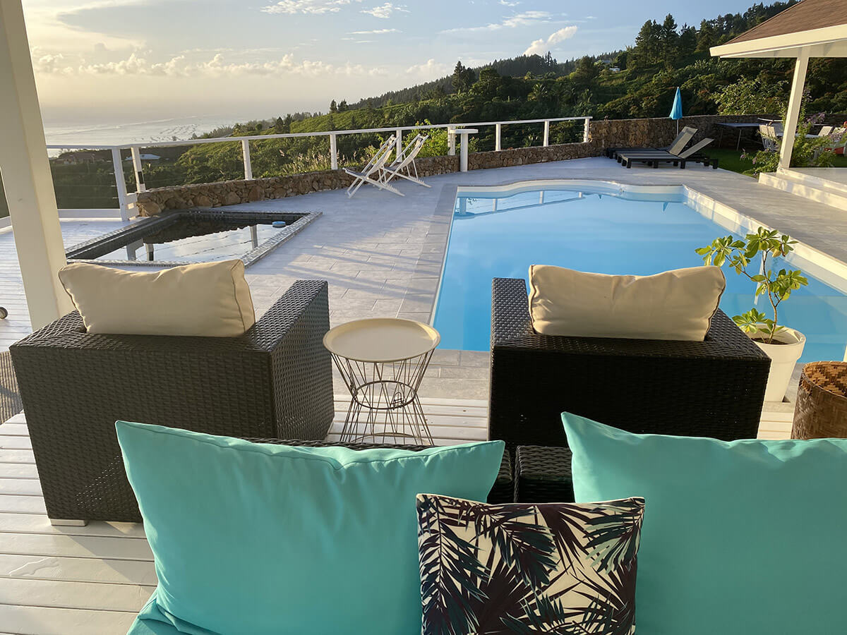 avec une piscine et un jacuzzi donnant sur une vue à 180°, avec l’accueil et la salle de restaurant,