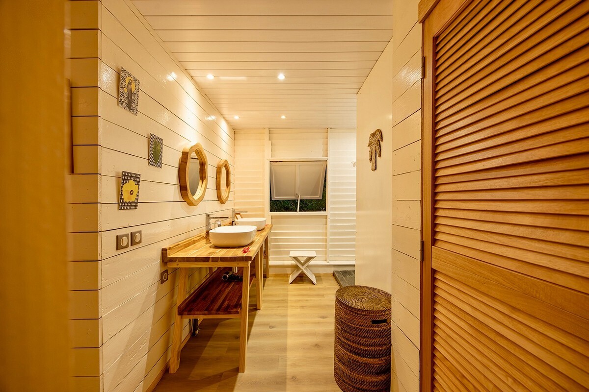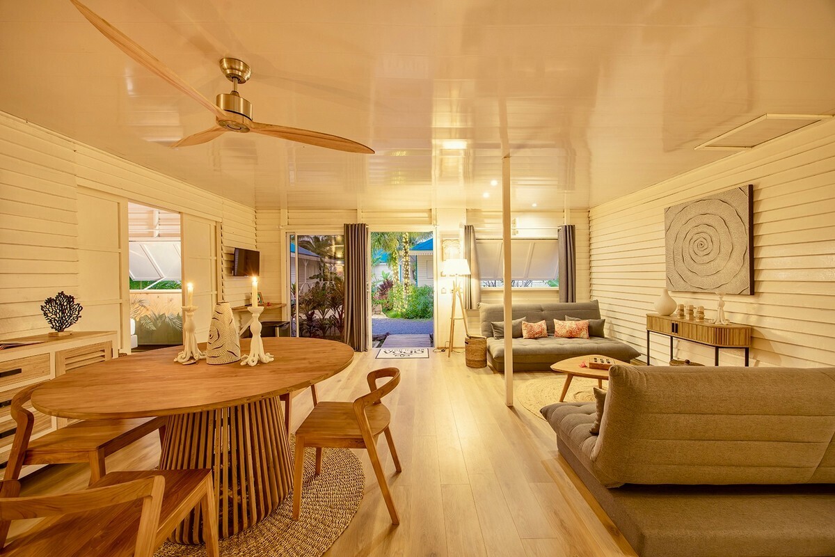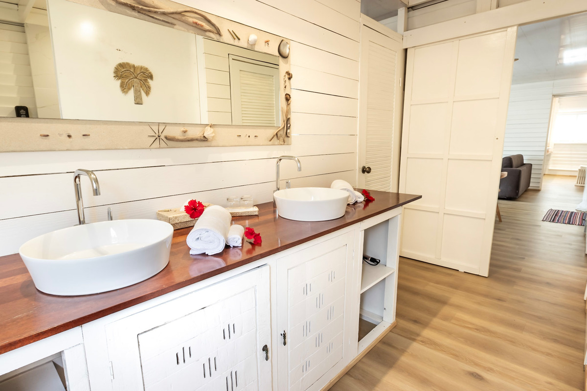 L’utilisation de végétaux locaux tels fibres de cocotier, racines de Miki-Miki pour les luminaires et miroiterie, la réalisation de frises de coquillages et thème marin pour les salles de bains, la mise en valeur de tissus aux motifs brodés, font partie des éléments de décoration, et s’intègrent parfaitement aux couleurs claires et lumineuses des bungalows et à l’ensemble du mobilier en teck cérusé blanc.