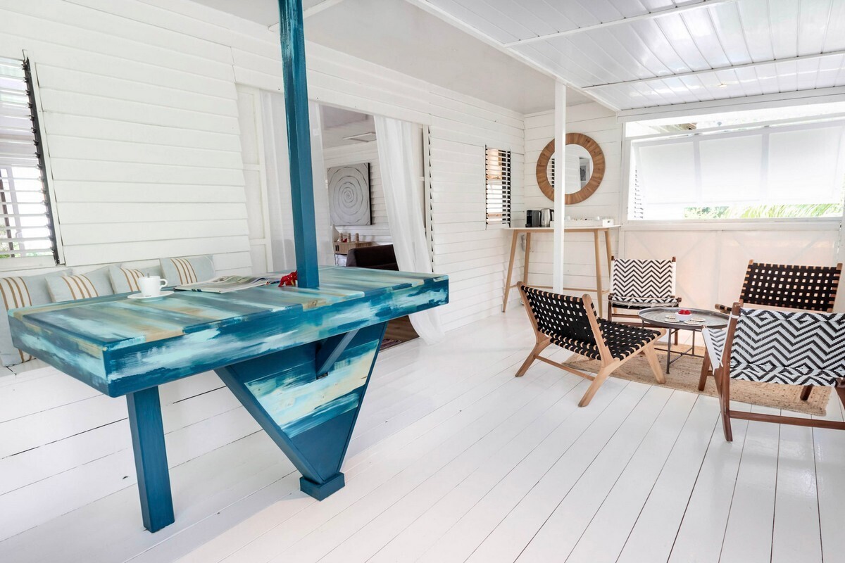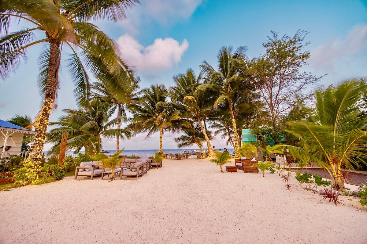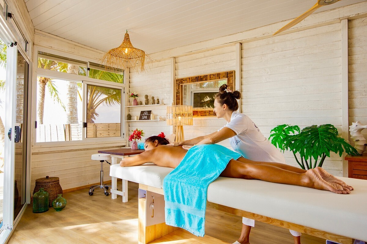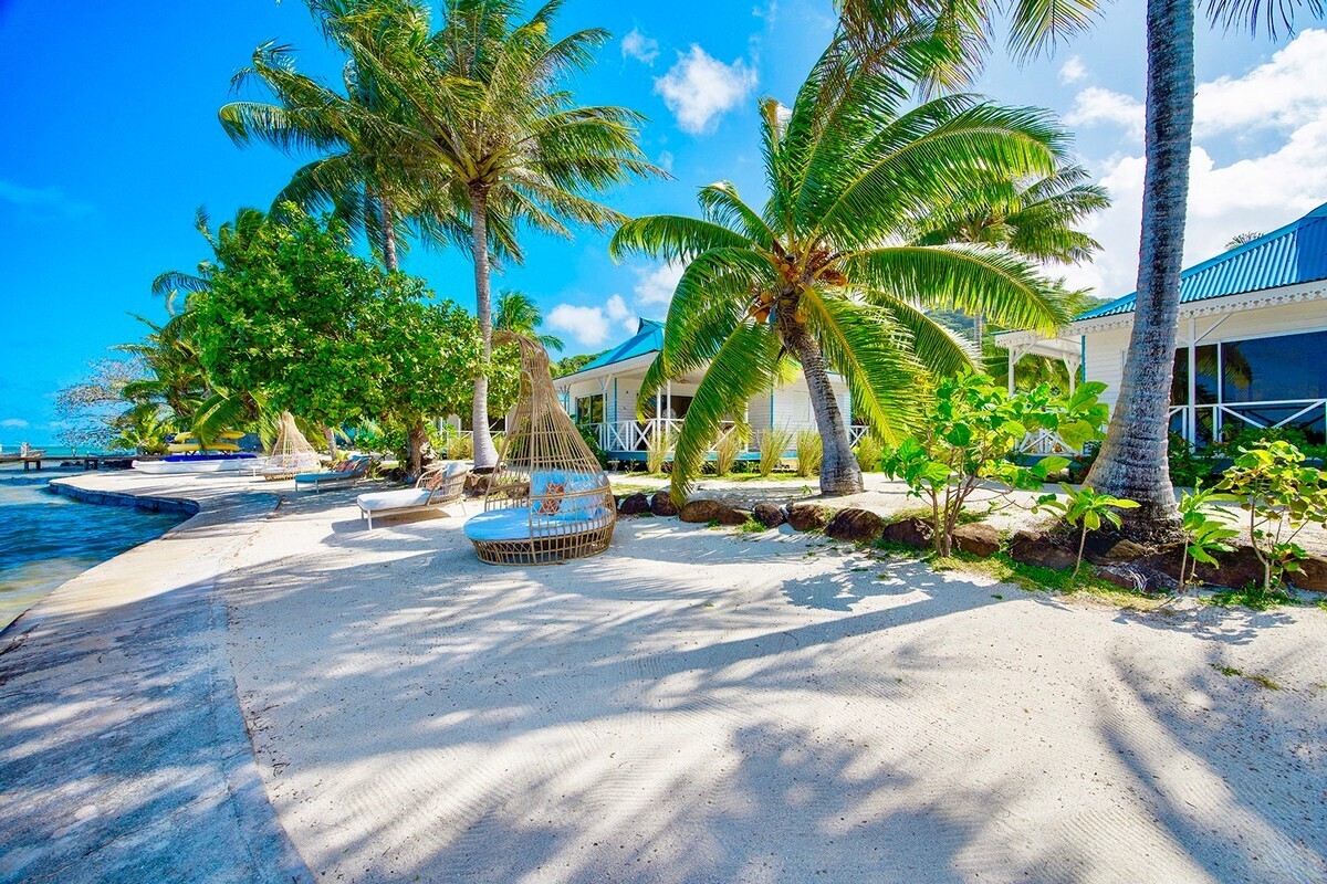 L’utilisation de végétaux locaux tels fibres de cocotier, racines de Miki-Miki pour les luminaires et miroiterie, la réalisation de frises de coquillages et thème marin pour les salles de bains, la mise en valeur de tissus aux motifs brodés, font partie des éléments de décoration, et s’intègrent parfaitement aux couleurs claires et lumineuses des bungalows et à l’ensemble du mobilier en teck cérusé blanc.
