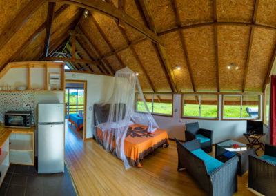 Tous les bungalows sont équipés d'une terrasse extérieure privée avec coin repas, d'une salle de bain privative avec nécessaire de toilette, d'une cuisine équipée, d'un coffre-fort, d'un lave-linge, d'une connexion Wifi