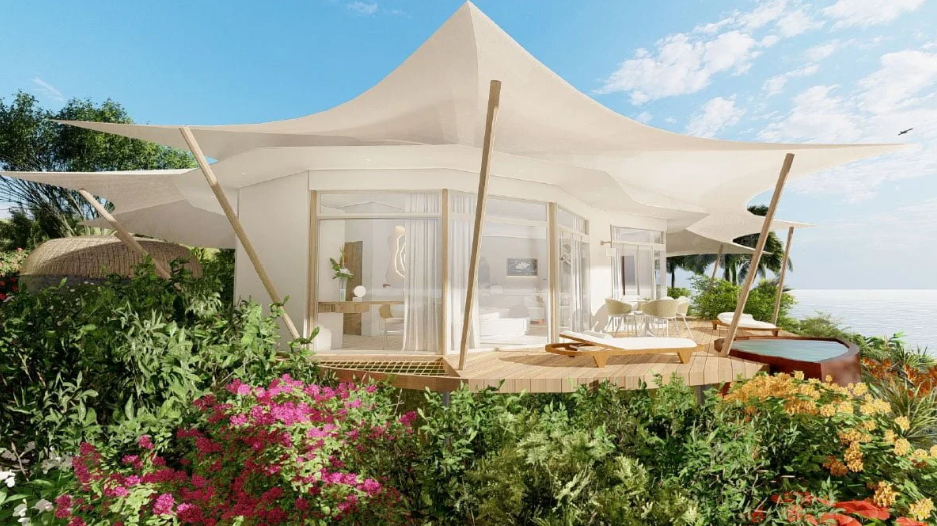 Luxueux et atypiques, les 15 bungalows du Apatoa Beach & Garden Village représentent des coquillages emblématiques de la Polynésie, avec leur toiles tendues et les jardins intimistes, ils s'insèrent avec modernité dans la nature environnante.