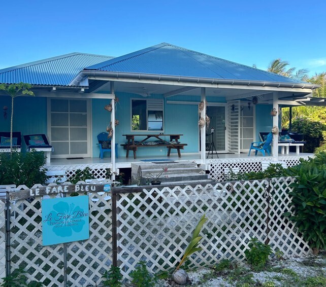 « Fare Bleu, pension de famille chaleureuse située sur l’île de Tiputa, est réputée pour son lagon bleu turquoise et ses paysages paradisiaques. L’établissement se trouve à environ 3 km du village de Tiputa, dans un cadre paisible et authentique, idéal pour découvrir le rythme de vie polynésien. »