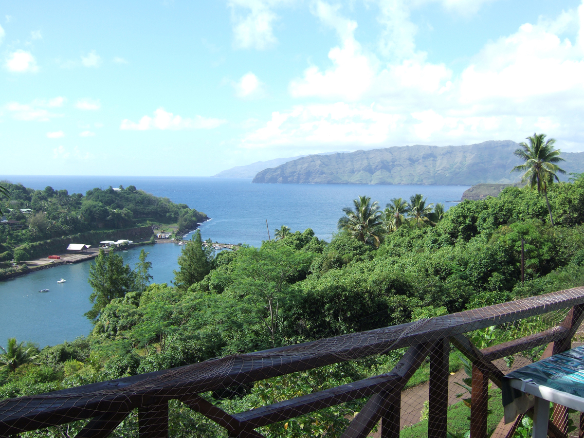 Sur les hauteurs du village d'Atuona, dominant le port, la baie et la verdoyante vallée de Tahauku, se trouve la pension Kanahau tenue par l'exubérante Tania.